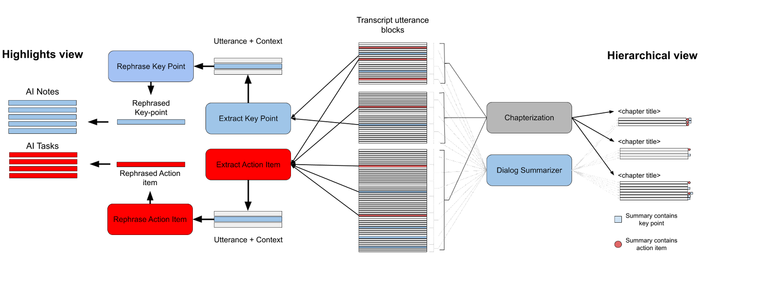 (a) Summarization pipeline that generates the two experiences illustrated below. Highlights experience (left) extracts top-N utterances as key-points or action items followed by rephrasing in 3rd person with context, and displaying as a sequence (Figure 1a). Hierarchical experience (right) segments the entire meeting transcript into sections, generates summaries for each section in 3rd person, and represents them sequentially in a minutes like format (Figure 1b). Summaries that contain key points or action items are marked with a corresponding number of stars and checkboxes respectively. Each rectangular block is a transformer model.