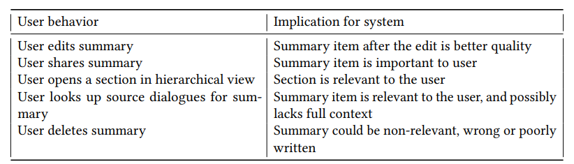 모델 동작을 사용자의 기대에 맞추기 위한 학습 데이터로 사용할 수 있는 상호작용을 탐색하기 위해[14], 사용자가 모델을 수정하고 지시할 수 있는 다양한 기능을 구현했다. 하이라이트 보기에서 사용자는 제안된 노트나 작업 항목을 직접 편집할 수 있다. 또한 자동으로 생성된 목록에서 노트와 작업 항목을 추가하거나 제거할 수도 있다. 계층 구조 보기에서도 마찬가지로 사용자는 요약이나 장 제목을 직접 편집할 수 있다. 사용자는 작업 항목도 제거할 수 있지만, 요약은 제거하면 일부 원시 회의 녹취록에 액세스할 수 없게 되므로 제거할 수 없다. 그러나 사용자는 다양한 하위 수준 요약에서 별표/체크박스를 추가하거나 제거하여 회의의 중요한 순간을 요점/행동 항목으로 표시하거나 제거할 수 있다. 또한 경험 상단에 '채팅으로 공유' 옵션을 제공하여 기본적인 공유 기능도 제공한다.
