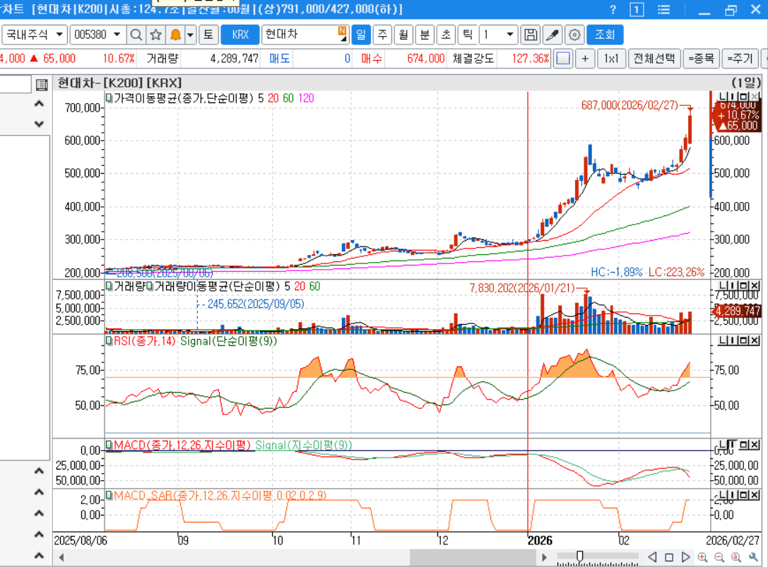| 장기 (1년 이상) | BUY | 2028년 로봇 양산·흑자 전환, 2030년 영업이익 15% 기여, 보스턴다이내믹스 IPO 가치(40조~60조 원). 자동차→피지컬 AI 플랫폼 대전환 구조는 유효. | 현 가격 또는 조정 구간에서 분할 매수. 삼성증권 목표가 800,000~850,000원을 장기 타깃으로 설정. |