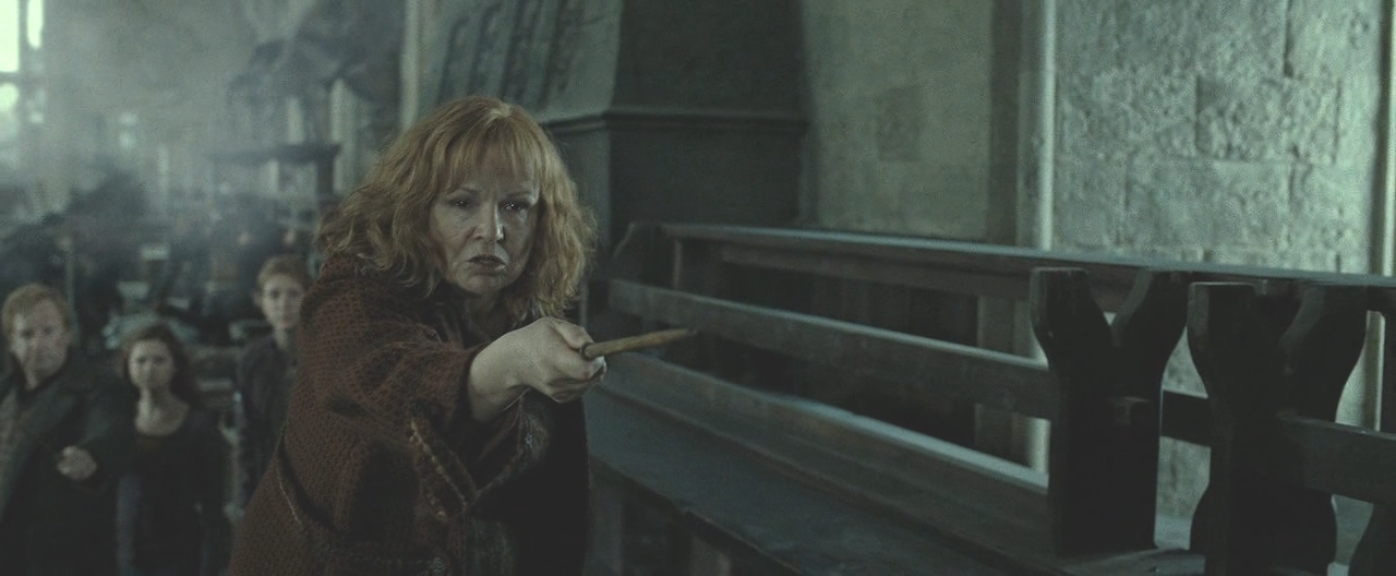 <죽음의 성물> 2부에서 벨라트릭스 레스트레인지와 대결하는 장면은 시리즈 전체를 통틀어 가장 강렬한 여성 캐릭터 순간 중 하나다. "내 딸한테서 떨어져, 이 나쁜 것아." 이 대사와 함께 몰리가 일대일 대결에서 벨라트릭스를 제압한다.